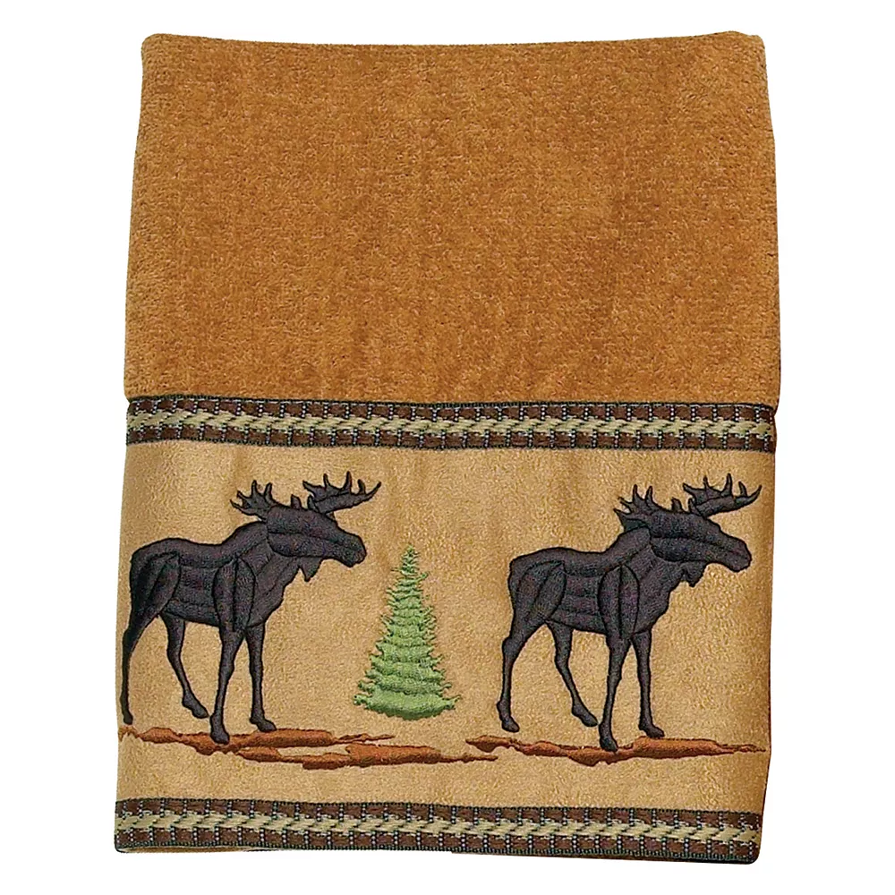 - Embroidered Moose & Pine trees on a microsuede band, Sheared velour towel