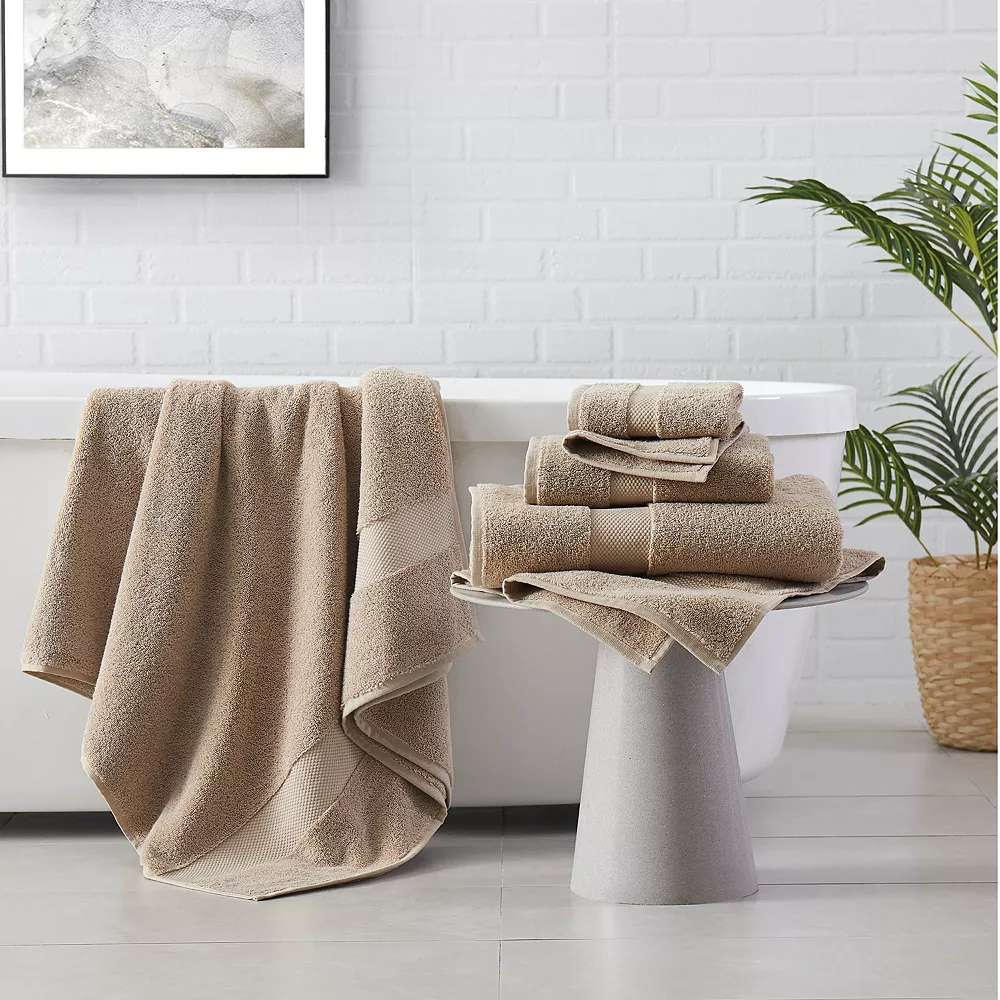 - Six-piece set includes: two bath towels (30″ x 58″), two hand towels (18″ x 18″), and two wash cloths (13″ x 13″)