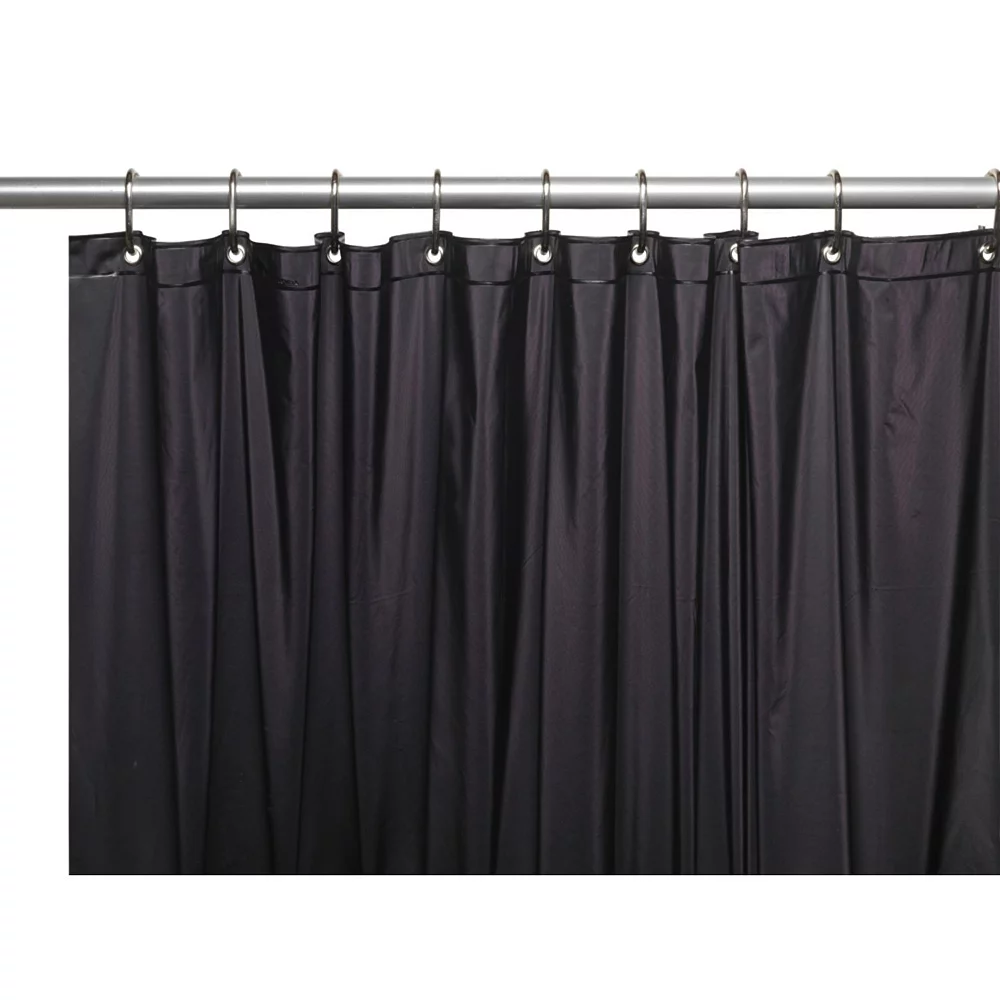 This Extra Long (72 wide x 84 long) Shower Curtain LinerSpecially designed to fit where a standard size curtain is too short, is made of a heavy, 5 gauge vinyl that easily wipes clean with a sponge in warm, soapy solution. Not only will this liner protect your fabric shower curtain, it serves nicely as a standalone shower curtain. Here in Black, you can find this style liner in Bone, white, sage, linen, frosty clear, and super clear. Wipe clean with damp sponge with warm soapy cleaning solution.