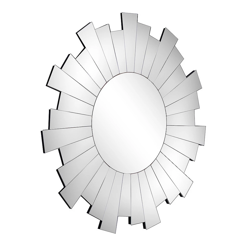 The Soleil Mirror is a contemporary piece that gives an elegant update to your nicely-decorated home. Featuring eye-catching sunburst design, the mirror can either be used as a statement piece or a finishing ornament. With mirror accents on the edges, this stylish mirror adds a new dimension to your room and complements pastel and bold backdrops alike. This 30 x 30 mirror has a high quality silver backing. Ready to hang either vertically or horizontally with pre-attached hanging mounts. Full mirrored sunburst. Hangs either vertically or horizontally. Pre-attached D-ring hanging mounts. Overall dimensions: 30 x 30 inches. Will brighten any home. Surface Shape: Flat. Purposeful Distressing Type: No Distressing. Mirror Height – Top to Bottom: 13.75. Mirror Width – Side to Side: 13.75. Largest Dimension: 29.625. Trend: Casual. Size: Medium (16-in to under 30-in H). Edge Type: Beveled. Mounting Bracket Included: Yes. Mounting Hardware Included: No. Tilting: No. Shelf Included: No. Wood Species: Pine.