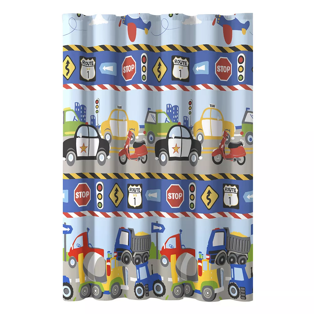 - Inspired by your little one’s favorite vehicles, the Dream Factory Trains and Trucks shower curtain will get them excited about bath time. Bustling trucks and tractors move across the face of this shower curtain to add adventure to the bathroom. Your child will even recognize some of their favorite street signs navigating all of the dashing vehicles. The bright and playful look will keep your little one in awe even after a long day of play.