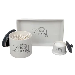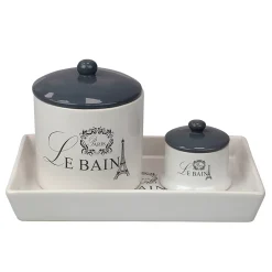 - Small Canister: 3″ x 3″ x 2.75″, Large Canister: 4.25″ x 4.25″ x 5″, Vanity Tray: 9.75 x 6 x 1.5″