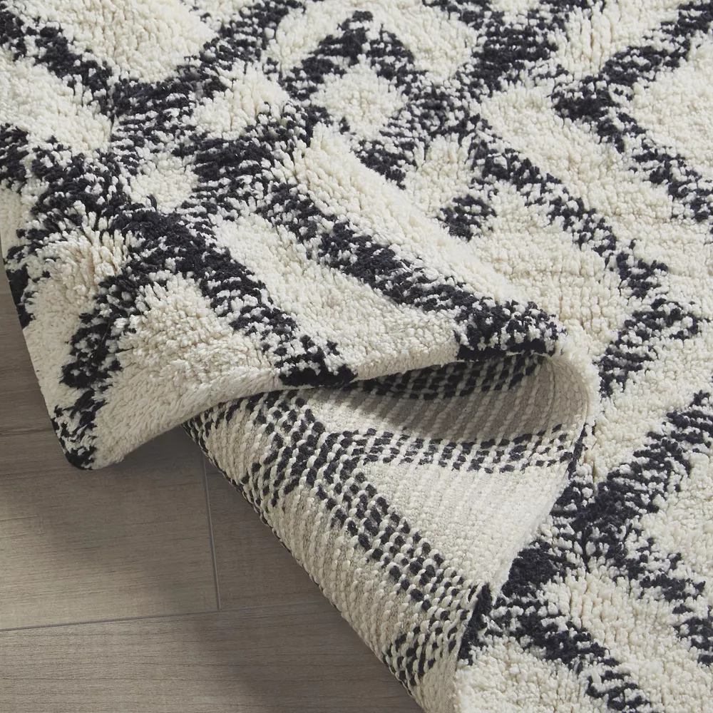 - Cotton tufted bath rug with yarn dyed geo diamond pattern.