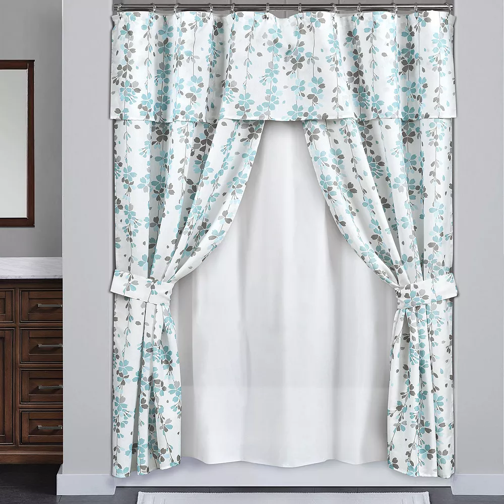 - Enhance your master or guest bathroom with this traditional style 16-piece complete shower curtain set. The flower petals appear to streak up and down this gorgeous shower curtain as if they’re on vines.