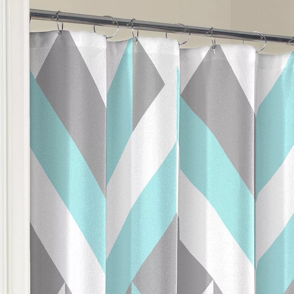 - This modern transitional shower curtain features a large scale geometric print in a soft color palette creating the perfect amount of style and sophistication.