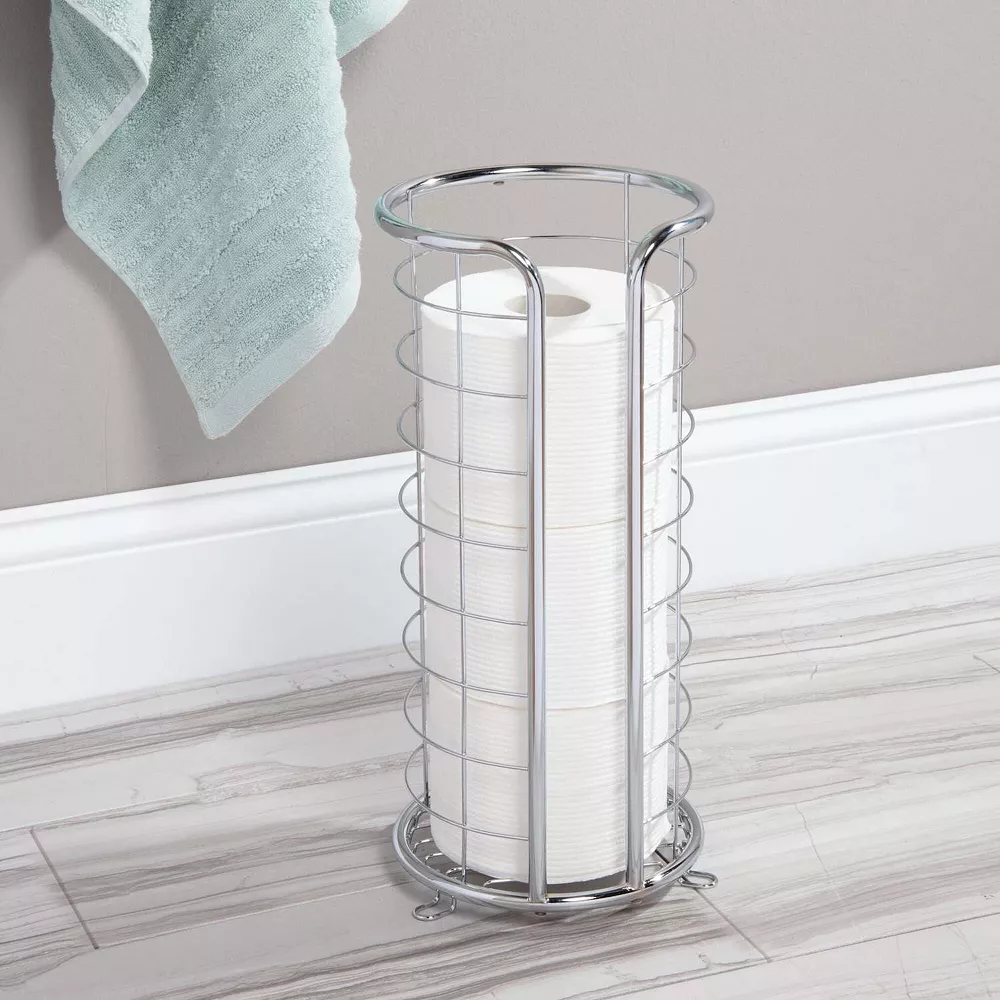 Keep toilet paper rolls handy and stored in style with this Toilet Paper Holder Stand from mDesign. This stylish holder has room to stash three extra jumbo-sized rolls. Featuring a cutaway front and open top, it’s easy to grab a roll quickly as needed. Raised feet on the bottom keep rolls off of the bathroom floor so they always stay clean and dry. Move this holder anywhere you want with its minimalistic, free-standing design. mDesign – Solutions for Home. Solutions for Life.
