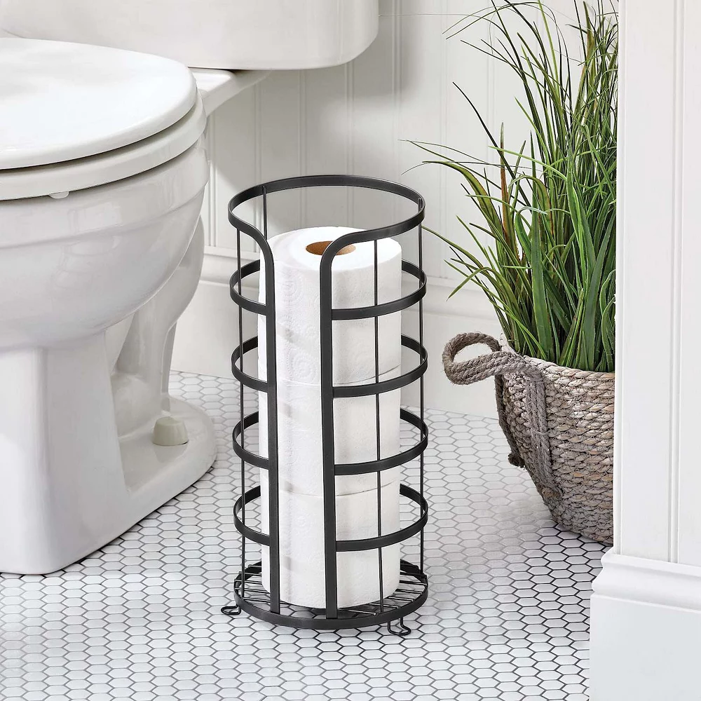 Keep toilet paper rolls handy and stored in style with the Toilet Paper Holder Stand from mDesign. The holder has room to stash three extra rolls. A cutaway front and open top makes it easy to quickly grab a roll. Raised feet on the bottom keep rolls off of the bathroom floor so they always stay clean and dry. Move the holder anywhere you want with the freestanding design.