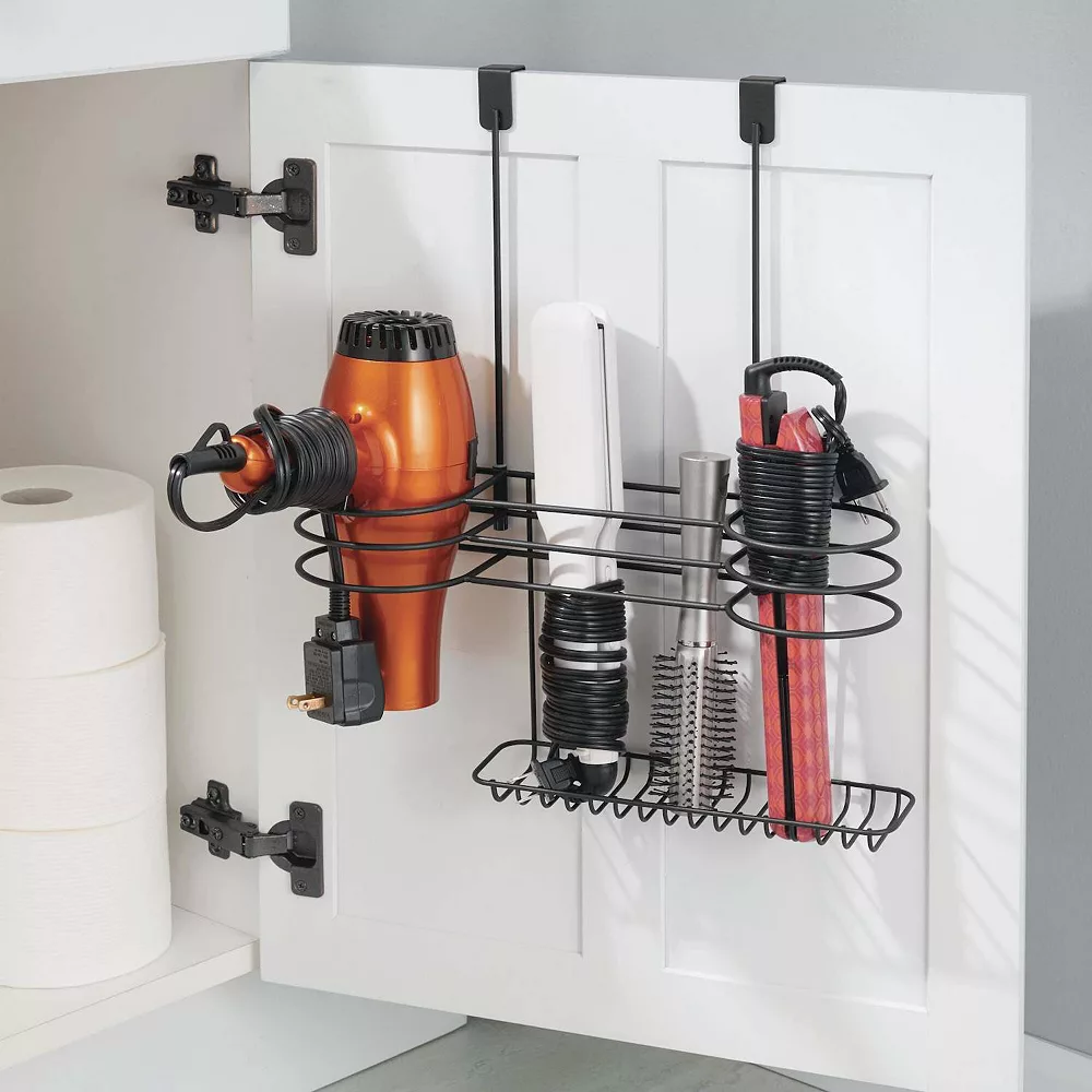 Tangled cords and hard to find hair care tools become a thing of the past with the Over the Door Hair Tools Organizer from mDesign. Four compartments hold all the tools you need for a great hair day, while the bottom ledge helps to keep cords organized. The organizer installs instantly by hanging over cabinet doors, on the outside for instant access or on the inside for discreet storage. The compact design lets you maximize your storage without cutting into already limited bathroom space.