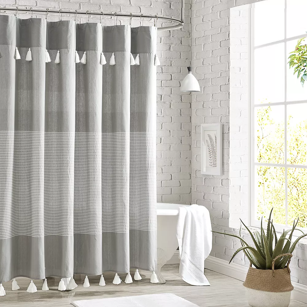 - Add a modern taste of coastal living to your shower and soak in the easy, breezy lifestyle with Panama Stripe Shower Curtain. Slim, sophisticated stripes race across the surface of this shower curtain. Vintage tassels dress the hem for a playful charm.