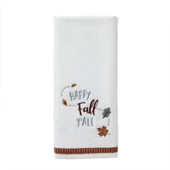 - Add a bit of fun and whimsy to the fall season. This soft cotton terry hand towel set features “Happy Fall Y’all” embroidery with falling leaves. It can be used in the bath or kitchen and also makes a great holiday or hostess gift.