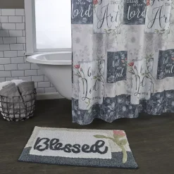 - Bring blessing and beauty to your bath. This lightweight fabric shower curtain features a patchwork floral pattern and inspirational sayings. 12 button-holes line the top for easy hanging; hooks sold separately. Use of a liner is recommended; not included.