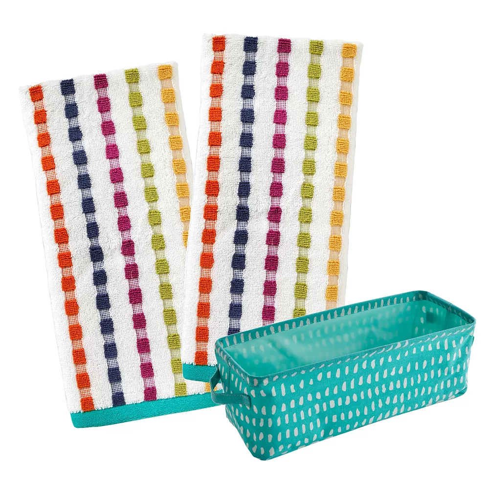 Bring on the “Good Vibes” and add some fun to the bath with this SKL Home Good Vibes Hand Towels & Dotty Waves Storage Bin 3-piece Set.
