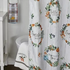 - The lightweight fabric shower curtain features a pumpkin and sunflower motif with a plaid border and seasonal sayings. 12 button holes line the top for easy hanging with the coordinating 12 pumpkin hooks. Use of a liner is recommended; not included.