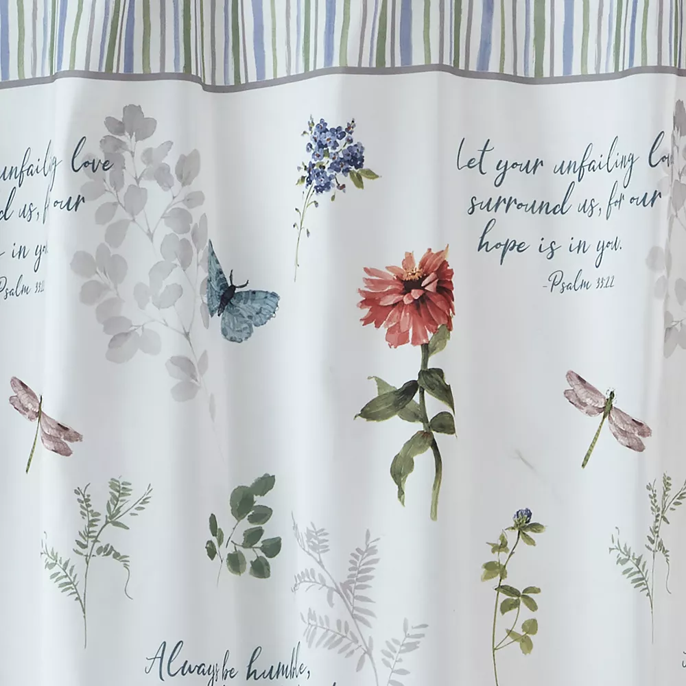 - Add inspiration and beauty to your bath with the Inspirational Meadows collection. This lightweight shower curtain features a pretty floral pattern, biblical verses and striped trim. 12 button-holes line the top for easy hanging. Use of a liner is recommended; liner/hooks sold separately.