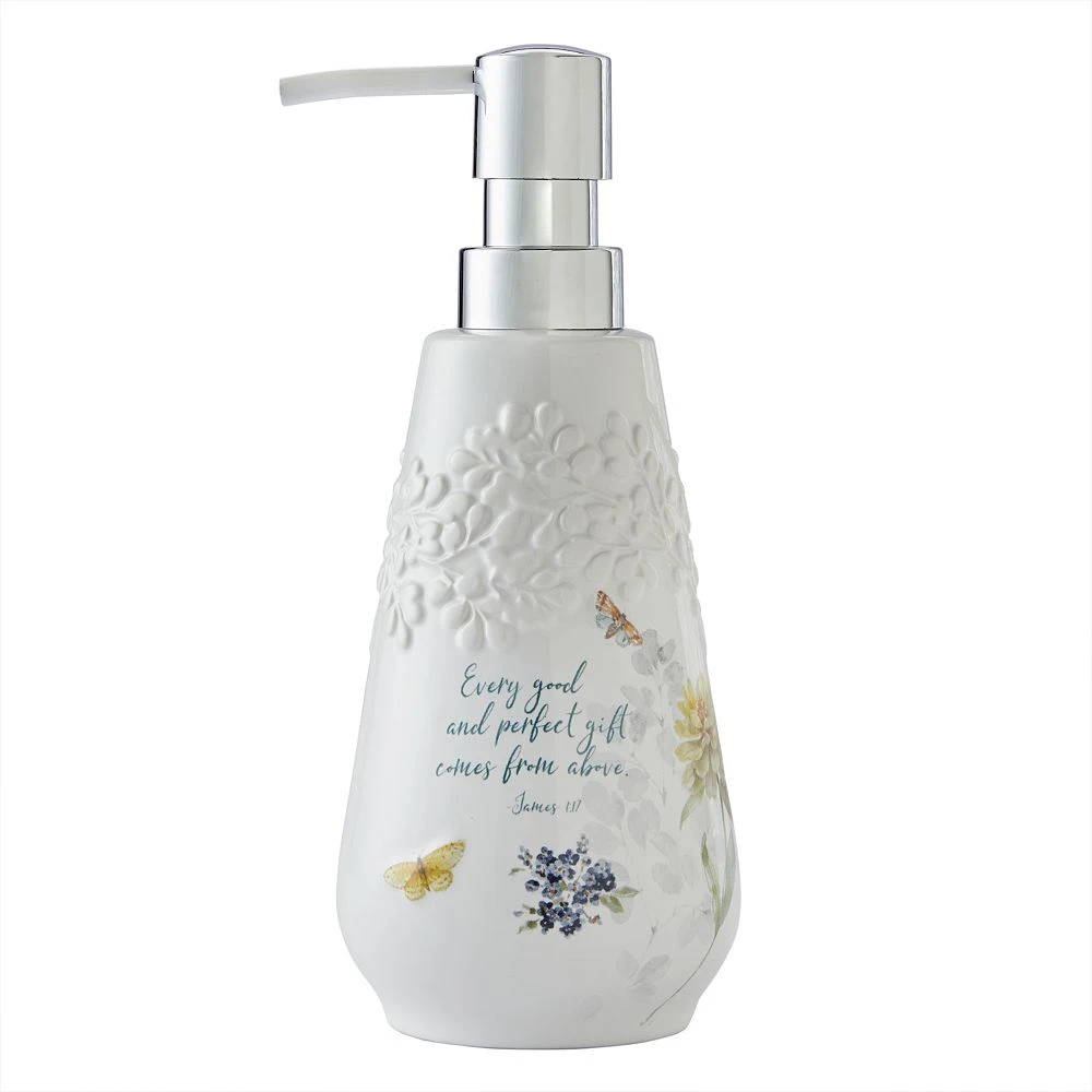 - Add inspiration and beauty to your bath with the Inspirational Meadows collection. This ceramic dispenser features a raised floral design, colorful floral print and James 1:17 bible verse. It can be used to hold lotion or liquid soap.