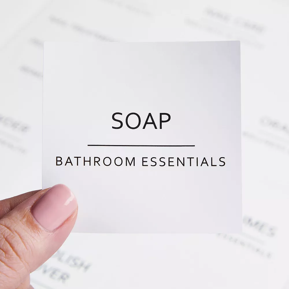 - Medicine Cabinet Labels: Create a picture-perfect bathroom with this set of 174 preprinted bathroom organization labels; the clear rectangular stickers include commonly used products, such as makeup, hair styling tools, dental care, fragrances, first-aid, grooming items, creams, lotions, shampoo, conditioner, toiletries, vitamins, and more