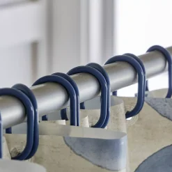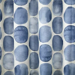 - Spot-on style. Give your bath a fun, fresh update with the Logan Bathroom Collection. This lightweight woven shower curtain features a blue-tone dotted pattern in a watercolor-like finish. Button holes line the top for easy hanging with the 12 U-shaped blue plastic hooks that are included. Use of a liner is recommended; liner not included.