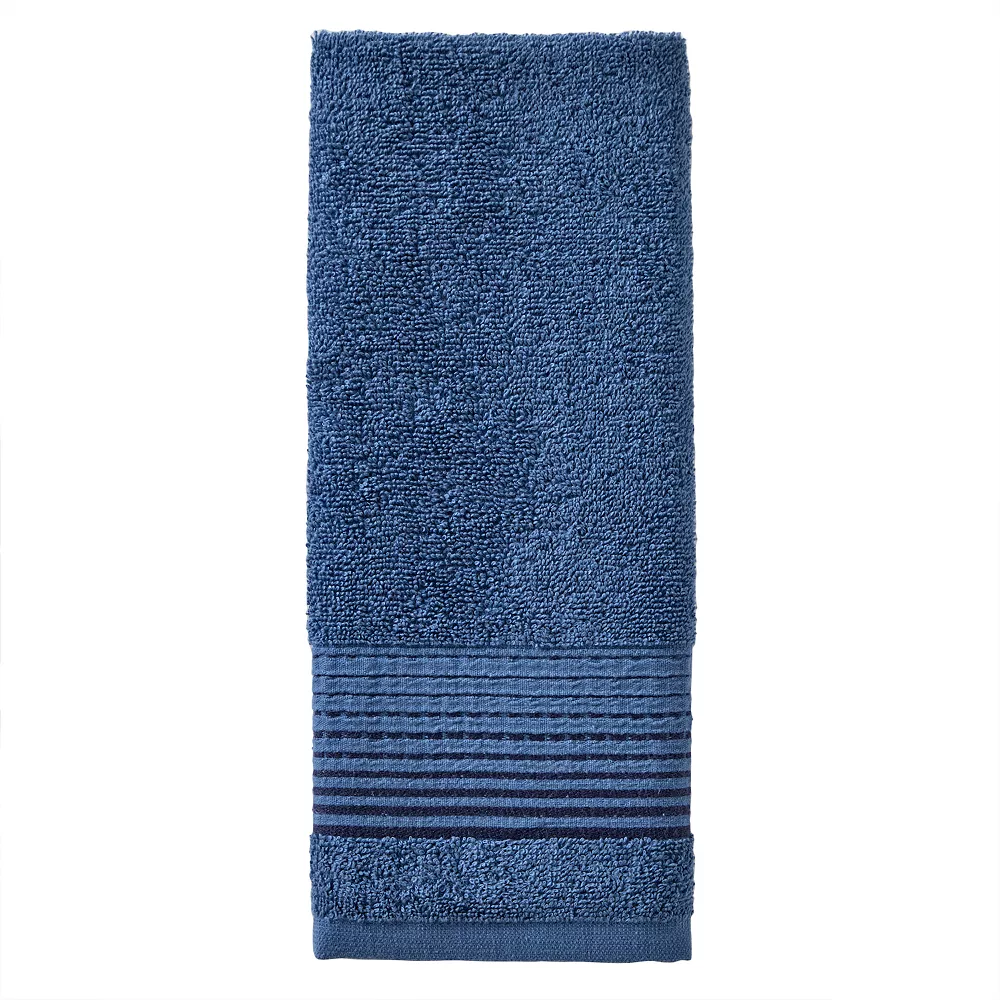 - Spot-on style. Give your bath a fun, fresh update with the Logan Bathroom Collection. Included are two hand towels. One towel is featured in solid terry with a woven weft insert and banded hem. The other towel is featured in soft cotton velour with a blue-tone dotted print.