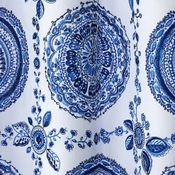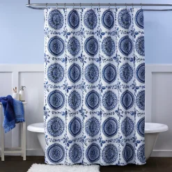 - Bring classic beauty to your bath with the Roseville shower curtain. This lightweight, machine-washable woven features a beautiful medallion design in rich shades of blue. 12 button holes line the top for easy hanging. Use of a liner is recommended; liner and hooks not included.