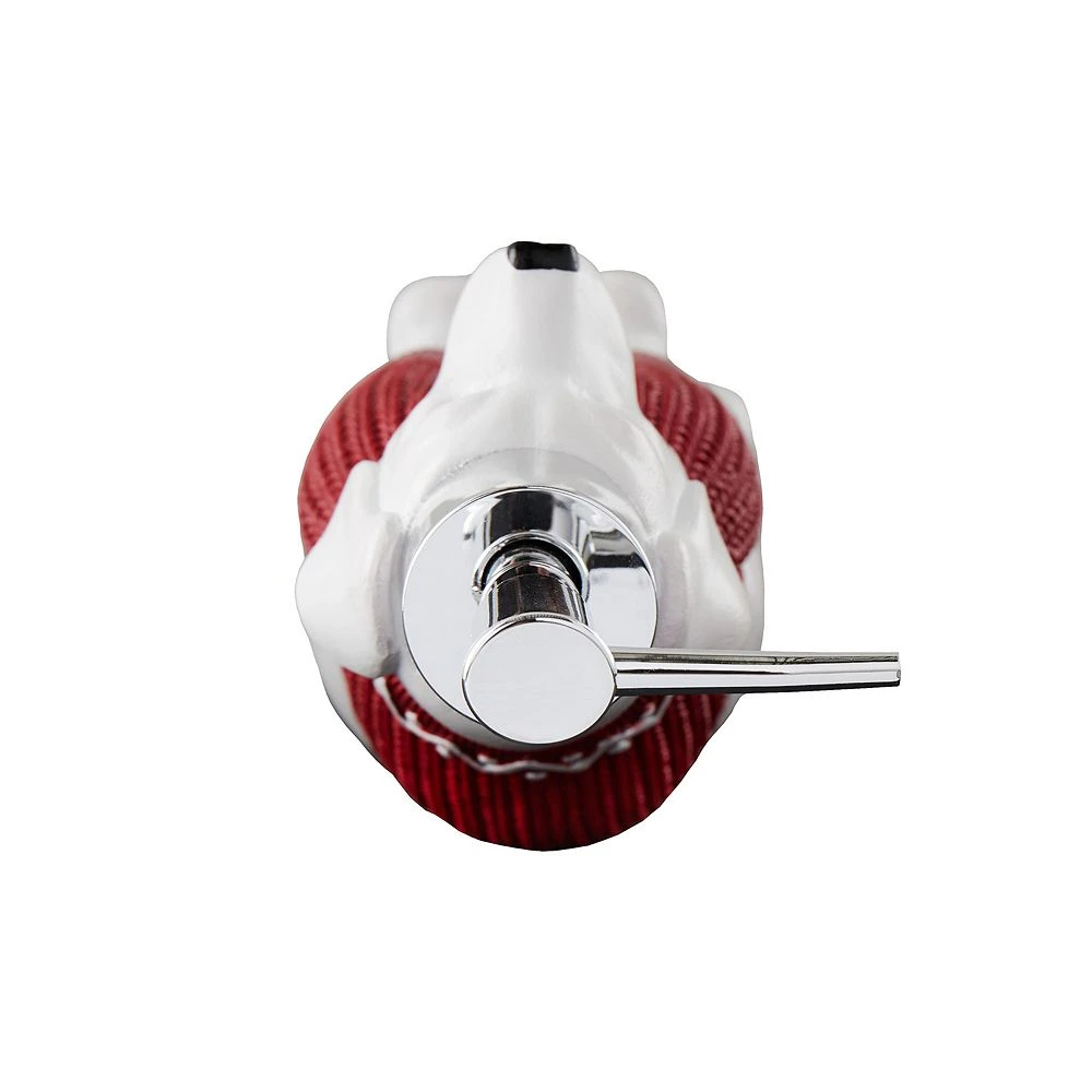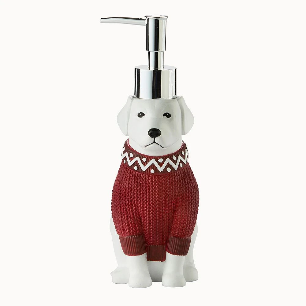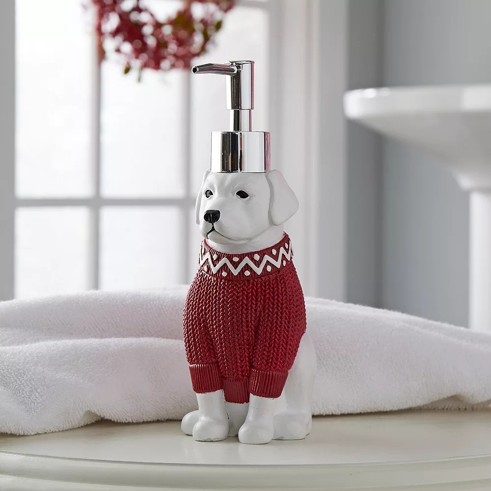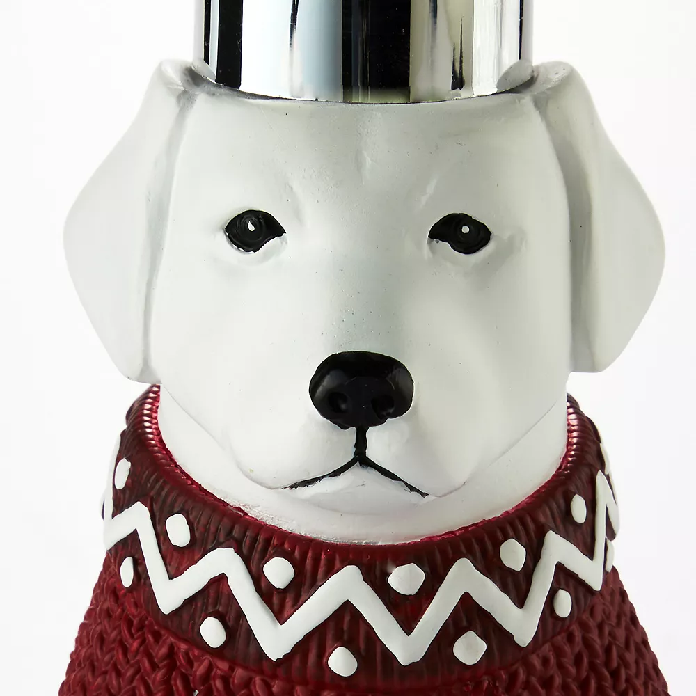 - Dimensional dog features a cozy red sweater and a chrome-like pump
