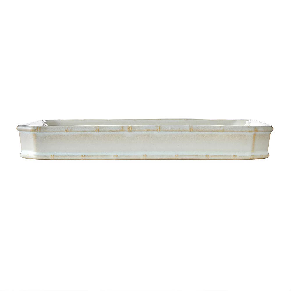 - This sculpted design, in tonal ecru, features a glazed finish and ribbed accents. It can be used to hold coordinating accessories, jewelry or other small vanity items.