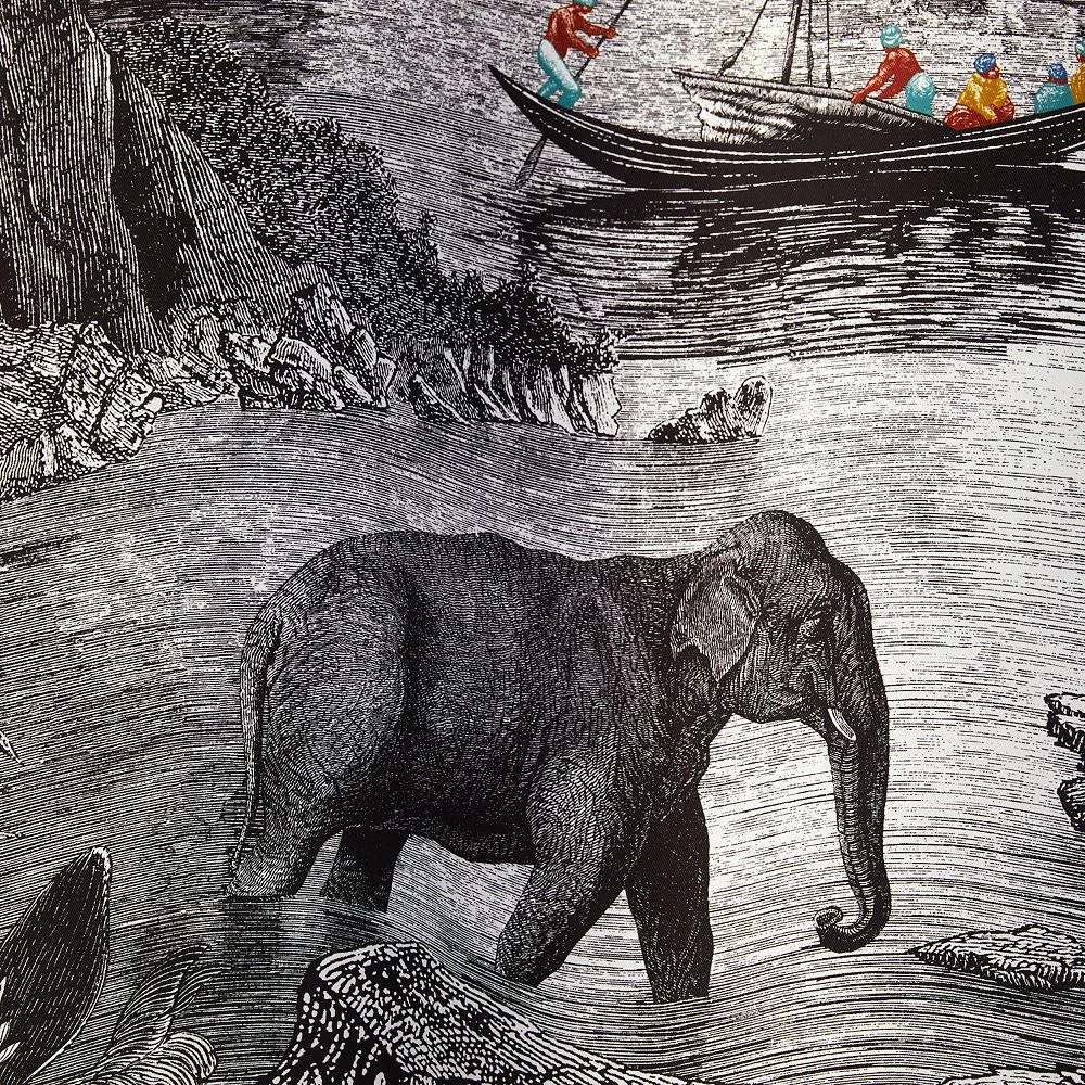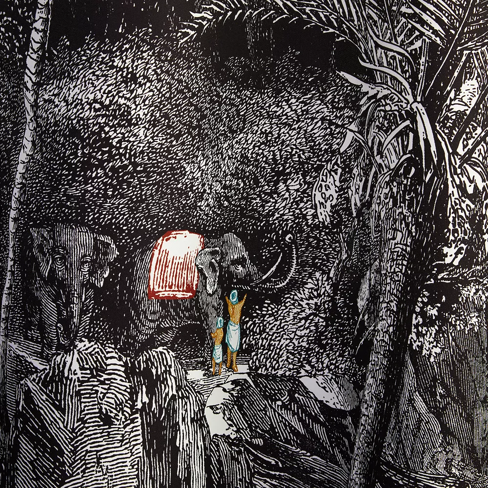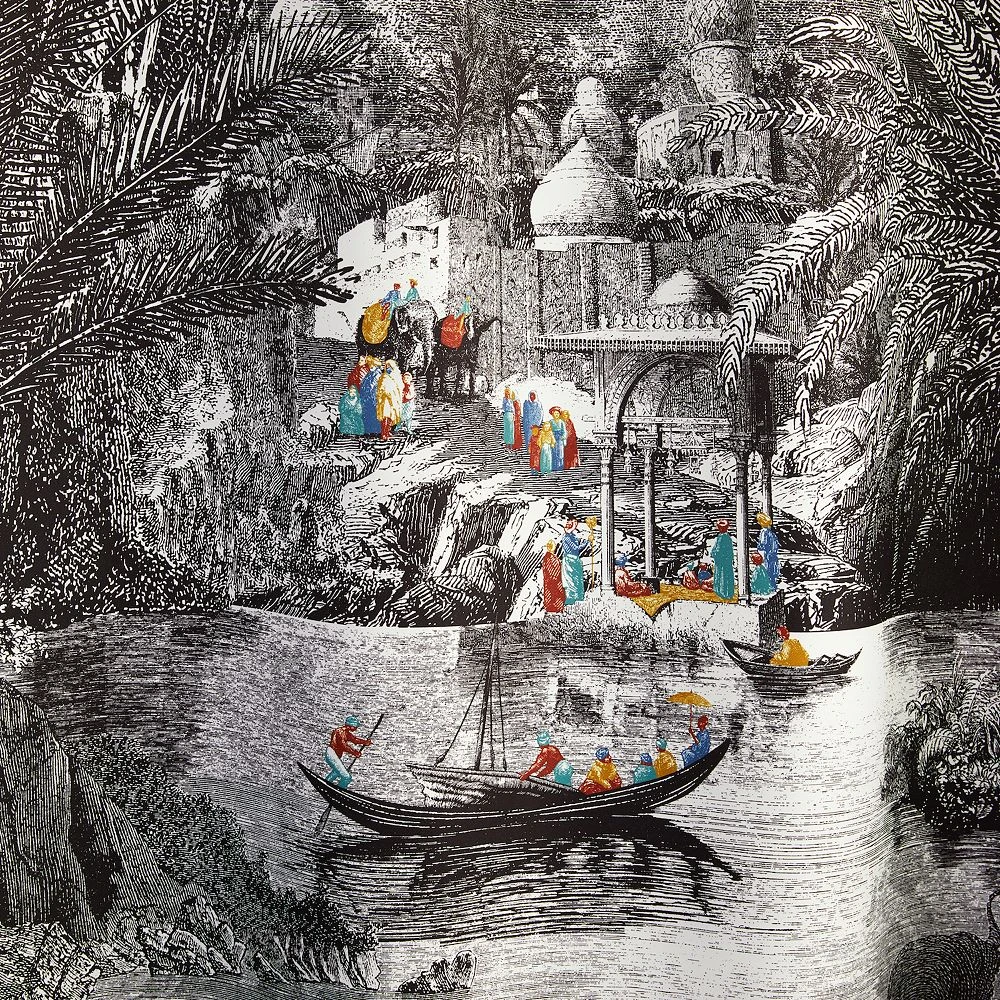 - Shangri La is part of the Vern Yip by SKL Home Collection. Inspired from the fantasy of the orient, the shower curtain features the mystical river and valley in black and white with tiny pops of color. 12 button-holes line the top for easy hanging; use of a liner is recommended (hooks/liner sold separately).